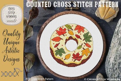 A YEAR OF DONUTS - NOVEMBER!\nAll 12 monthly Donuts looks good enough to eat!\nSo much fun no matter how you use them! And even better, no calories! lol\nCross Stitch Patterns designed by Marcia Manning.\nEach month's Donut is the same size: 80 stitches wide by 80 stitches high.\nPDF is a COLOR counted cross stitch chart which lists suggested DMC floss colors, and includes a color picture.\nStitched design size is as follows: \n11 count: about 7.27" x 7.27"\n14 count: about 5.71" x 5.71"\n16 count: about 5.00" x 5.00"\n18 count: about 4.44" x 4.44"\n\nAdditional image shows October's Donut stitched on our matching BLANK. Image on the left as a coaster and image on the right as an insert into my "It's A Wrap" pillow wrap/wall hanging. Sewing pattern is available as well as the cross stitch blanks.