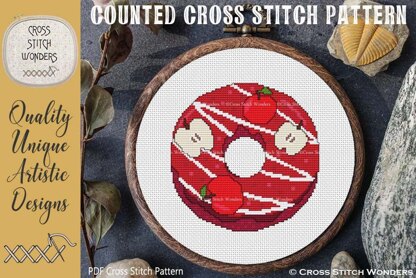A YEAR OF DONUTS - SEPTEMBER!\nAll 12 monthly Donuts looks good enough to eat!\nSo much fun no matter how you use them! And even better, no calories! lol\nCross Stitch Patterns designed by Marcia Manning.\nEach month's Donut is the same size: 80 stitches wide by 80 stitches high.\nPDF is a COLOR counted cross stitch chart which lists suggested DMC floss colors, and includes a color picture.\nStitched design size is as follows: \n11 count: about 7.27" x 7.27"\n14 count: about 5.71" x 5.71"\n16 count: about 5.00" x 5.00"\n18 count: about 4.44" x 4.44"\n\nAdditional image shows October's Donut stitched on our matching BLANK. Image on the left as a coaster and image on the right as an insert into my "It's A Wrap" pillow wrap/wall hanging. Sewing pattern is available as well as the cross stitch blanks.