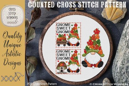 NOVEMBER - A YEAR OF GNOMES!\nCross Stitch designs by Marcia Manning.\nEach monthly Gnome comes with three designs.\nOne of the Gnome and a wagon, one of the Gnome and a mushroom hut, and one of the Gnome alone.\nThe wagon and hut designs are 92 stitches wide by 92 stitches high.\nThe Gnome by itself will be within 86 stitches wide and high.\nStitch the entire design or just the Gnome!\nPDF is a COLOR counted cross stitch chart which lists suggested DMC floss colors, and includes a color picture.\nStitched design size is as follows:\nSize 11 count: 8.36 x 8.36 inches or 21.24 x 21.24 cm\nSize 14 count: 6.57 x 6.57 inches or 16.69 x 16.69 cm\nSize 16 count: 5.75 x 5.75 inches or 14.61 x 14.61 cm\nSize 18 count: 5.11 x 5.11 inches or 12.98 x 12.98 cm