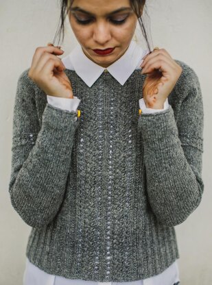 Yarn: 5 (6, 6, 7, 8) (8, 9, 10, 10) skeins of Brooklyn Tweed Loft (275y/ 251m, 50g, 100% wool) or 1310 (1490, 1660, 1840, 2010) (2190, 2370, 2540, 2720) yds/ 1200 (1360, 1520, 1680, 1840) (2000, 2170, 2320, 2490)m of any fingering weight yarn. You may substitute a woolen-spun yarn in fingering weight for a similar result.