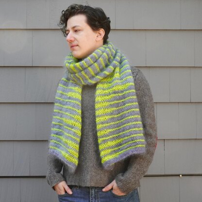 Finished Size: 18 x 68” (46 x 172 cm) rectangular wrap. Yarn: Approx. 315 yards (288 m) of MC and approx. 264 yards (241 m) of CC. Yardage may vary, see notes on yardage below and yardage chart in photos. • Main Color (2 skeins) - JMR Studio Worsted Weight Mohair, 245 yards (225 m) per 4 oz; 78% Mohair, 13% Wool, 9% Nylon. • Contrast Color (1 skein each, both yarns held together) - JMR Studio Fingering Weight Mohair, 320 yards (293 m) per 100g; 63% Silk, 23% Kid Mohair, 11% Nylon, 3% Polyester Held with Lavender Lune Yarn Co. Suri A