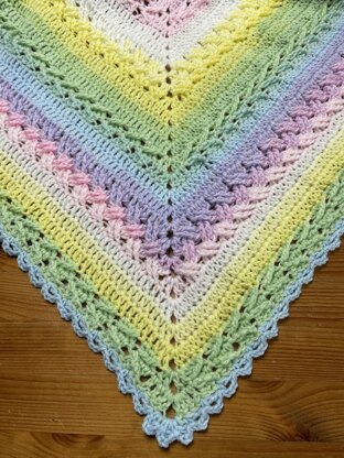 This delightful baby blanket was inspired by the Abigail Shawl and contains many beautiful textures and colors that will stimulate a baby's eyes for hours! Worked in the round, you can make this blanket as small or as large as you prefer. Pattern includes links to complete video tutorials (for both right and left-handers).