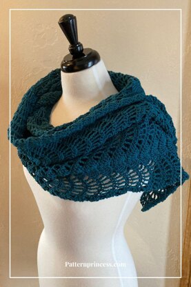 This Abigail Crochet Sideways Shawl uses the Feather and Fan stitch pattern, which forms a gorgeous drape thanks to its lace structure. It is sure to become a cherished keepsake for years to come. This elegant crochet stitch is easy once you get a few rows in as it is a stitch repeat of rows 2 and 3. Any time a pattern repeats like this, I find it becomes easier to do with each row.