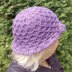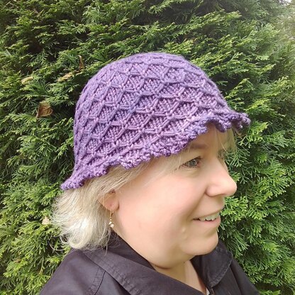 A feminine cloche-styled hat with plenty of texture to draw the eye. This stitch pattern reminds me of a dahlia flower with its soft, scooping petals. The hat is accented by a delicate picot edging.