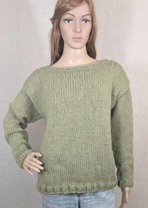 Quick and easy sweater, knit in the round using bulky brushed acrylic yarn and large needles. Basic knit and purl stitches in stockinette stitch, garter stitch and 2x2 rib stitch.