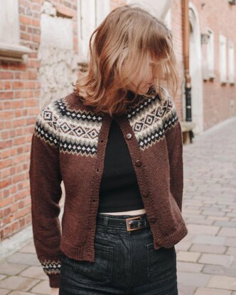 Abria is a top down seamless raglan cardigan that is knit flat. It features a ribbed neckline worked followed by short rows at the back of the neck that create a comfortable fit. There are raglan increases that are simultaneously worked with Fair Isle colourwork across the yoke.