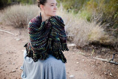 Finished Dimensions: Approximately 80.5”/204.5 cm wingspan and 26”/66 cm deep, after washing and blocking. Yarn: Lorna’s Laces Shepherd Worsted Multi, 100% Superwash Merino, 225 yards/4 oz, 4 skeins Christmas at Downton Abbey (note: Edging uses almost 2 skeins). Gauge: 20 sts and 16 Rows = 4” in Stockinette Stitch after washing and blocking. Needles: US 10 (6 mm) 32”/80 cm circular or preferred method to work a large number of sts flat and size needed to obtain gauge. Notions: Scissors, tapestry needle, stitch marker