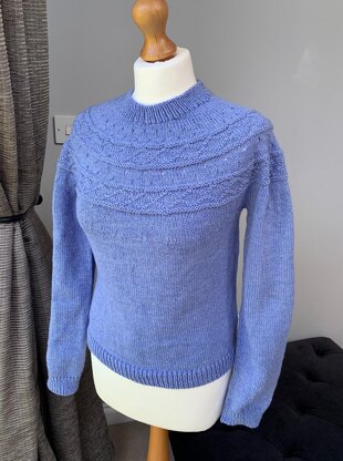This sweater is knitted seamlessly in the round from the top down. Starting with a circular yoke with short rows at the back of the neck, increases are then worked into the yoke along with a raised diamond pattern and eyelet detail.