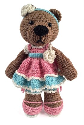 Adelaide is a sweetheart bear perfect for bear lovers of any age. She's made in single crochet, and wears a rose-trimmed crocheted frock, ruffled bloomers, headband and Mary Jane shoes. Shown here, she's made with acrylic worsted-weight yarn and heathery-colored wool yarn for her clothing. She is about 14" tall.