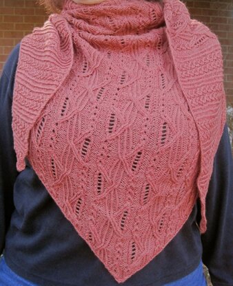 This lightweight triangular shawl incorporates three distinct Japanese lace stitches. It is knit top down, and the stitches cause a pretty and delicate scallop at the neckline. While the shawl looks difficult to knit, it is not hard, and is suitable for Intermediate knitters.