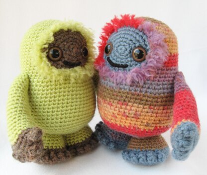 This is my original pattern to crochet yourself an Adorable Monster. You can use mohair-type yarn to make a lovely furry little guy, maybe an Adorable Snow Monster (the smaller, cuter relative of the Abominable Snowman), or a Flaming Adorable Fire Monster. Or use ordinary yarn to make a smooth one, like my Tree Monster and Rainbow Monster, with their great big hands and fuzzy ruffs around their faces.