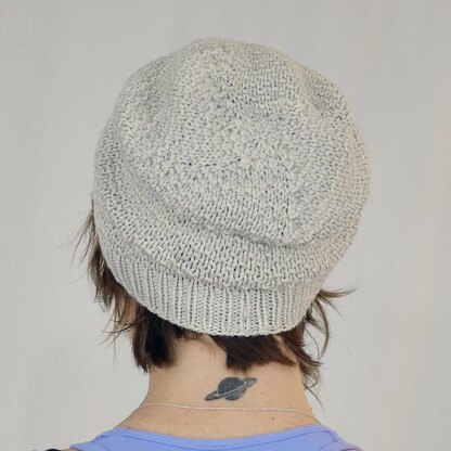 Adrastea is a reversible hat that buttons to create a gathered look, it is worked from the bottom up in the round. The stitch pattern works great for showing off the texture of a light colored yarn or for showing off color changes in semisolid yarns. Named for one of the moons of Jupiter, which was in turn, named for one of the nymphs that cared for Zeus in his infancy.