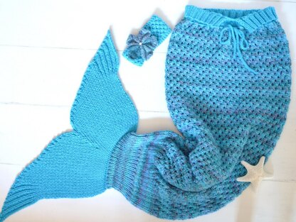 Please note that the fit of the snuggle is loose for comfort - This is NOT a fitted, figured tail design so there is no real shaping involved except for the tail fins, where I give row-by-row instructions. The snuggle blanket is knitted in the round so that there are no seams and NO sewing involved except for the joining the headband. You'll need to be happy knitting on a circular needle and on straight conventional needles with 2 or 3 strands of yarn held together.