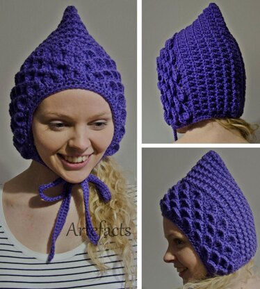 This is a lovely, textural hat with an unusual (but easy) rib stitch for the main part of the hat, and a wide edging of ‘scales’ (crocodile stitch) to frame the face. This pattern uses ties to hold the hat on your head.
