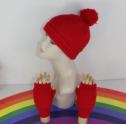 Adult Teen Aran Moss Stitch Bobble Beanie & Fingerless Gloves