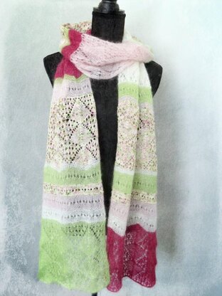 As of April 2021, there are now 3 VERSIONS of this (2019) design. Version 1 is the (original) Multi Coloured Speckled Long Scarf, V2 is a shortened version of V1, and V3 is a variation of the design using Fingering Weight Speckled Sock yarn ... with 4 shades of Rowan Kid Silk Haze added for a different & floaty effect. (1 ball of each colour)