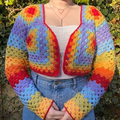 The pieces are joined as you go, so there’s no seaming afterwards. The sleeves are worked in the round downwards from the shoulder to the cuff. This pattern is great for using up yarn scraps.