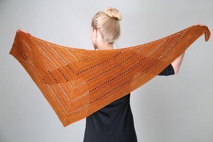 Aeris (Latin for copper) is an asymmetrical triangular wrap that takes full advantage of the luxurious yarn with which it was knit. Eyelets, textured stitches, and garter stitch pop in this merino and cashmere blend, which is so soft and light that it’s difficult not to wear it at all times. Strategically placed increases give this shawl its off-kilter triangular appearance, which is long enough to wrap comfortably around ones torso without too much length at the center point, or too many ends dangling in the way. The simple stitch patterns keep the knitting fun and, in worsted weight yarn, this is quite a quick knit as well.