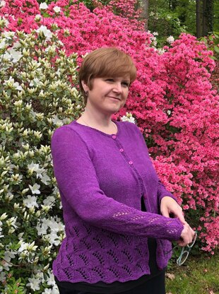 Yarn: Dragonfly Fibers Dance Rustic Silk, 100% Silk; 450 yards/4 oz, 2(2, 2, 3, 3, 3) skeins. Sample knit in Heliotrope.