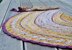 Afterglow ist ein großes halbmondförmiges Tuch, das von oben nach unten in einem horizontalen Rippenmuster und echtem Patent in zwei Hauptfarben gestrickt wird. Den letzten Abschnitt ziert ein Kreismuster in zweifarbigem Patent, das mittels Farbwechsel sowie Zu- und Abnahmen entsteht.