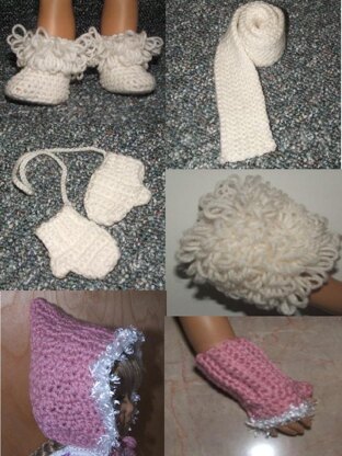 Pattern for 6 different winter accessories for your American Girl doll or similar 18″ doll. Set includes Fluff Hat, Fluff Fingerless Mittens, Fluffy Boots, Muff, Mittens on a String and a Scarf. Quick and easy patterns, a great way to use up all your odds and ends of yarn while keeping your doll toasty warm on those cold winter outings!