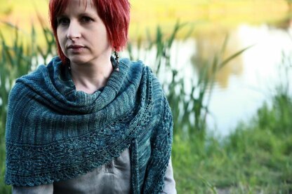 “Aguo” is a crescent-shaped shawl knit from side to side in one piece, featuring a stockinette stitch body interspersed with garter stitch ridges. The sophisticated, richly textured border showcases a Japanese lace pattern bordered by columns of twisted stitches and eyelets.