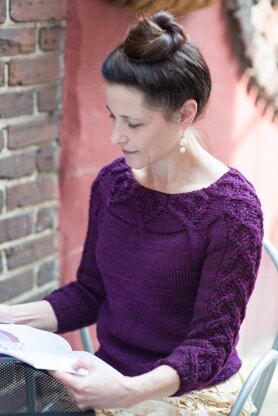 This rounded yoke pullover is constructed from the top down in one piece with raglan increases to shape the bodice. To create a flattering fit there are short rows to shape the back neckline higher than the front. This pullover is designed with negative ease in the bust. If you desire a looser fit work one size bigger. There is no body shaping past the armholes. The length of the body is easily adjusted.