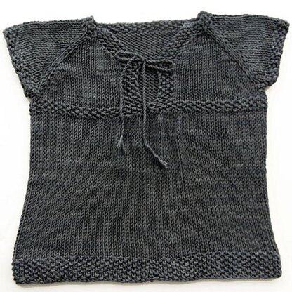 Baby Tunic with Seed Stitch Hems The perfect lightweight long top for tots when you want a simple knit with boutique details. Knit from the top down with short raglan sleeves. V-neck pullover style with cord ties makes it easy to put on and remove. Seed stitch empire waist with increases at the front of chest creates a lovely drape. Sizes 3 to 24 months. Perfect for spring and summer, or layer over a long sleeve shirt in the winter.