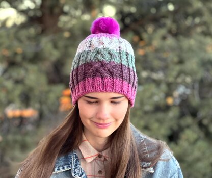 Includes pattern for the Aidan Cabled Hat in three sizes:
