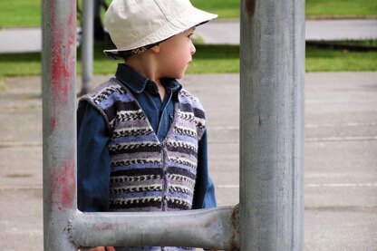 What a great vest to wear over a shirt! Using strands taken from the self-patterning yarn, the squares of colour on the back echo the stripes on the front to great effect. Because it's sleeveless, it's really built for action!