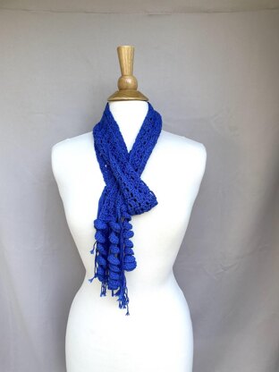 Construction: Scarf is worked from end to end with a bias lace texture, corkscrews and fringe are added to the ends
