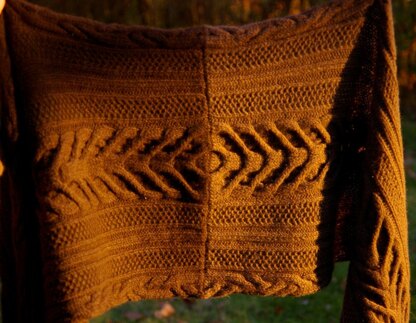 This two-colored wrap is inspired by the trees in the woods. The two sides are worked from the edges into the center and joined together with the 3-needle BO on the wrong side. It begins and ends with a 2x2 ribbing. The body of the wrap is worked in columns of seed stitch and ribbing with a center cable motif. The edges are defined by cables on each side.