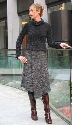I have a fondness for skirts with uneven hems and slanting lines, like this one which is knit seamlessly from the hem up, and finished with a grosgrain ribbon waistband and snaps for a smooth fit. The slip-stitch pattern creates a fabric that is a mixture of knitting and weaving, and will skim the body without clinging. When you knit the short rows to shape the hem, there is no need to make or hide wraps, as the slip-stitch pattern hides the turns automatically.