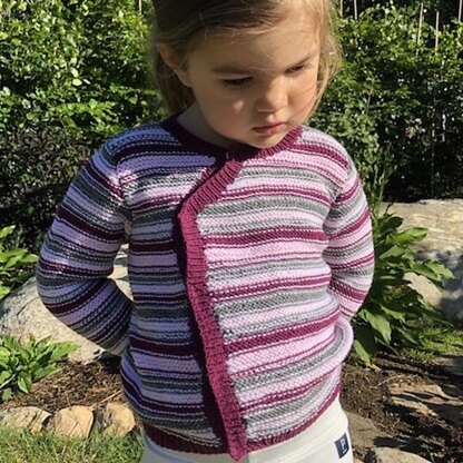 Asymmetrical cardigan, in soft merino wool. Closes with hidden press buttons. Garter stitch stripe pattern in four colors. Front- and back panels are knitted in one piece, so there are no side seams to sew. The pattern also includes photos, diagrams, sketches of all pattern pieces and a list of abbreviations. The cardigan can be machine washed using a wool program.