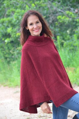 Ponchos are wonderful garments ~ fun to knit, fun to wear & always in style. A pretty cable & eyelet pattern trims the collar of this poncho, with the eyelets mirrored around the hemline.
