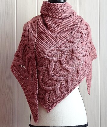 Alba shawl is a contemporary triangular shawl featuring a lace and cable panel surrounded by classic garter stitch.