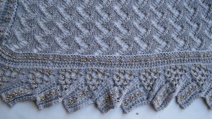 This is a pattern for a delicate lace shawl made using fingering weight yarn.. This is the perfect shawl for an air conditioned restaurant, or chilly fall or spring evening. The focal lace stitch is an unusual one and a “true” lace stitch, and is easily learned, once worked. It adds a bit of dimension to the shawl. It is finished with a one of the Shetland Edgings and is attached in the usual Shetland manner, but there have been (optional) beads added if you enjoy “dressing up” your shawls a bit.