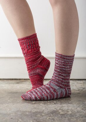 Alec and Jane are twins, they are the same but different; Jane can inflict excruciating pain and Alec can numb all senses completely, leaving you helpless. Jane can only affect one person at a time, Alec can use his 'gift’ against many. This 'pair’ of socks is inspired by this concept, the sharp, twisted stitch pattern runs vertically down one sock and horizontally across the other. The colours in the Same Difference yarn are grey for the robes of the Volturi Guard, in which Alec and Jane play a pivotal role, and red for their eyes.