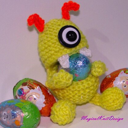 This is Alfred the egg monster, he likes to eat chocolates, knitted flat with straight Knitting needles, easy to follow pattern, with row by row written instructions and photo-tutorial.