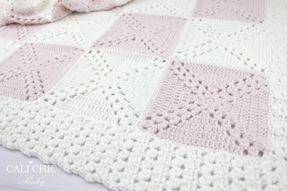 Granny Square Crochet Baby Blanket Pattern, Alice #173 for an elegant unisex crochet baby blanket with modest edging. This is a design that is fun to create as you make 25 individual granny squares and connect them per the instructions. You will be proud to give this completed cute blanket you made yourself as a gift for a family member or a lucky new mother!