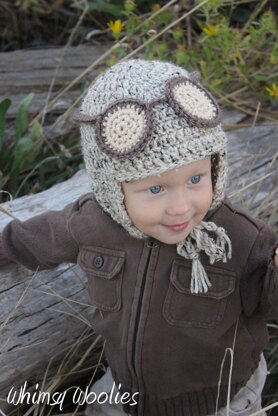 This cap features a tiny brim and earflaps, with goggles created separately, which are attached in the finishing. A sweet aviator cap for a sweet boy!