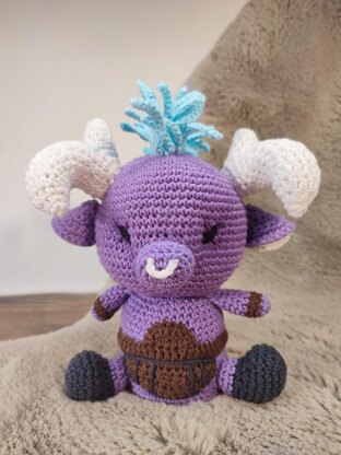 English PDF crochet pattern of collectible creature inspired by Alistar from League of Legends.