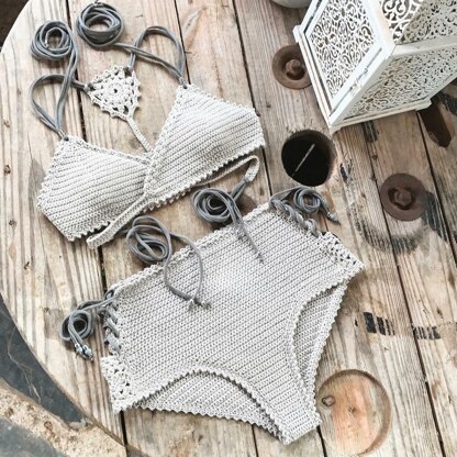 Materials needed: 250g of Fine/2 (sport/baby) or Light/3 (DK/light worsted) weight yarn. Crochet hook 3.5mm/ E (check the gauge), smaller hook approximately 3mm/D. Lycra fabric for the side ties . Some beads if you choose to decorate the ties.