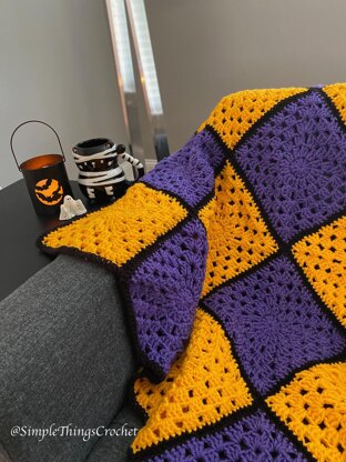 This simple brightly-colored afghan is done in the perfect colors to add a mystical touch to your Halloween decor! It measures 38”x38” so it’s a small throw that’s easy to store after the holiday. You will need 2 skeins of Color Made Easy in Turmeric, 2 skeins in Ultraviolet and 1 skein in Caviar.