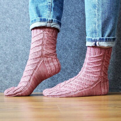 The Almina socks feature an eye-catching, travelling cable motif, which transitions beautifully from and into a matching ribbing on cuffs, heels and toes. They are inspired by my previous Almina designs (2 shawls and a sweater).