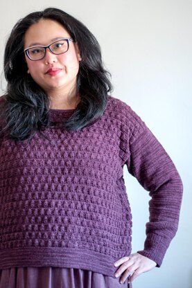 Almondine is a casual modified drop-shoulder pullover worked seamlessly in the round. The body features easy bands of “almonds” created with increases and decreases, and is worked in the round from the hem to the underarms before dividing for the front and back. The garter stitch shoulders are shaped with short rows and joined with a Three-needle bind off.