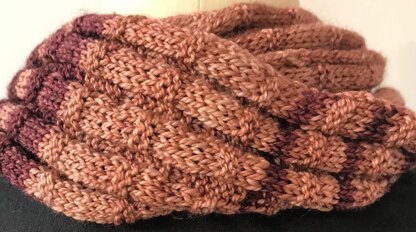 The scarf uses a total of** 70g**, or 50g of Color 1 (Blush) and 20g of Color 2 (Black Cherry).