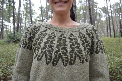 The Alocasia Pullover was inspired by one of my favorite houseplants Alocasia Polly. The plant boasts large dark green arrowhead shaped leaves with highly defined spines and veins in a lighter green. The yoke of the sweater features the unique leaf shape radiating out from the collar. Knit from the top down in the round this sweater requires no seaming and is a fun balance of two color stranded knitting and simple stockinette stitch. Knit up in Brooklyn Tweed’s Loft yarn the sweater has a rustic, woolly feel and slightly tweedy appearance. The Alocasia Pullover is the perfect sweater to bring a little houseplant joy to your wardrobe in the cooler months!
