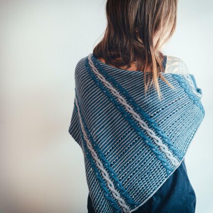 Along the Way Shawl has colorful cables traveling over the whole piece, and garter stitch stripes creating a simple background for these cables. Made of two colors and a clever mosaic-like technique, this shawl is easier to knit than it looks like, as only one color is used on each row. Near the end, some rows incorporate an eyelet pattern to create an airy border. This triangular shawl is worked sideways, and is meant to be made with fingering weight yarn but is fully adaptable to accommodate your preferred yardage and weight.
