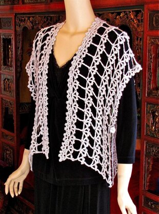 Alzannah is a quick to crochet vest that converts easily to an asymmetrical & ruana-type wrap. The pattern includes choices for customizing both length and width, crocheting larger sizes, and converting the vest into a ruana or wrap. It's a pleasure to try it on as you go; it's constructed from the center out to each sleeve opening.